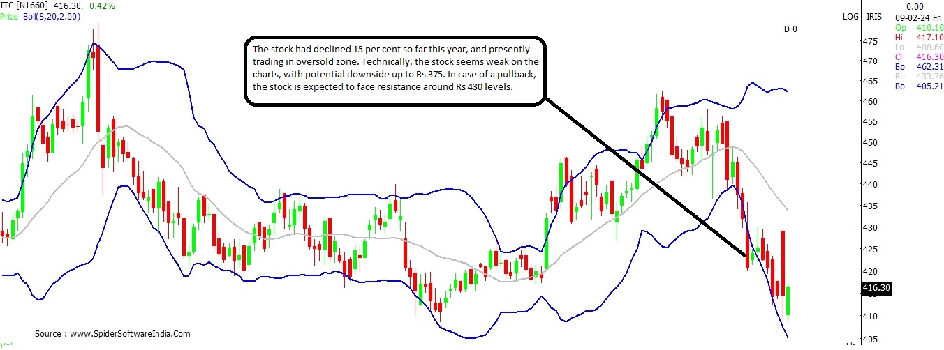 On the weekly scale, the stock is trading below its key support at Rs 420. A weekly close below Rs 420 could indicate further weakness at the counter. On the downside, the stock seems on course to tests its 100-WMA (Weekly Moving Average) which stands at Rs 375 - thus indicating a downside potential of 10 per cent from present levels.