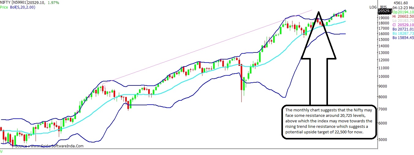 On the longer-term scale, the Nifty seems headed towards the higher-end of the Bollinger Bands on the monthly chart, which suggests that the index may face some resistance around 20,725 levels.