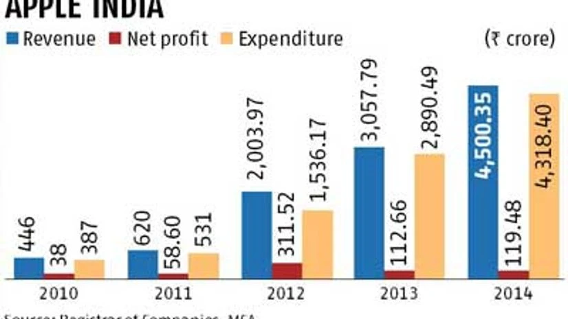 In FY14, Apple's India unit has spent Rs 4,318 crore, which includes all operational expenses, in the country, from Rs 387 crore in FY10. The company recorded a profit of Rs 312 crore in FY12, which shrunk to Rs 113 crore in the next year. In FY12, Apple India's revenues rose 223 per cent to Rs 2,004 crore and net profit soared 431 per cent to Rs 312 crore.
