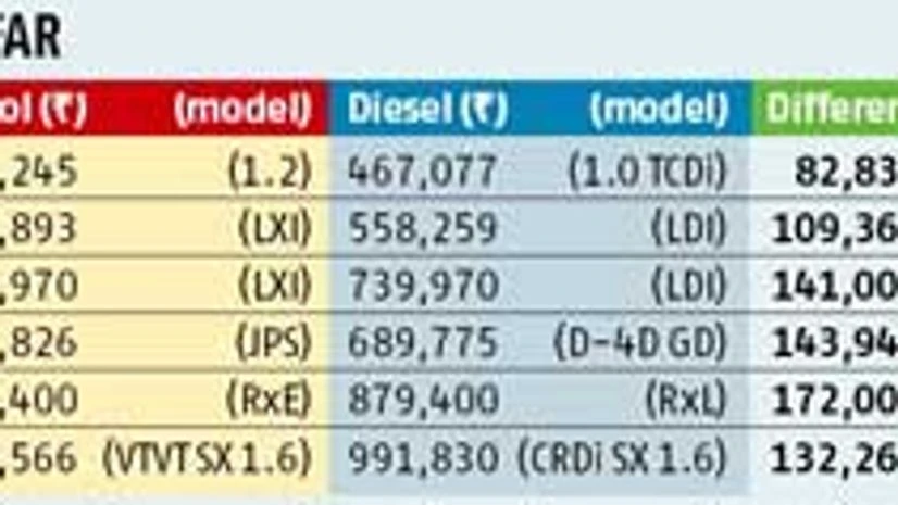 Currently, diesel models command a premium ranging from Rs 80,000 for hatchbacks to nearly Rs 200,000 for C segment sedans over the petrol versions of the same models with near-identical peak power delivery.