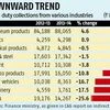 On the other hand, iron & steel yielded 1.5 per cent less receipts from excise duty collections at Rs 17,342 crore in 2013-14 against Rs 17,603 crore in 2012-13. Similarly, excise duty collections from tobacco products were Rs 16,050 crore in FY14 — 10.8 per cent less than Rs 17,991 crore in FY13, it said.