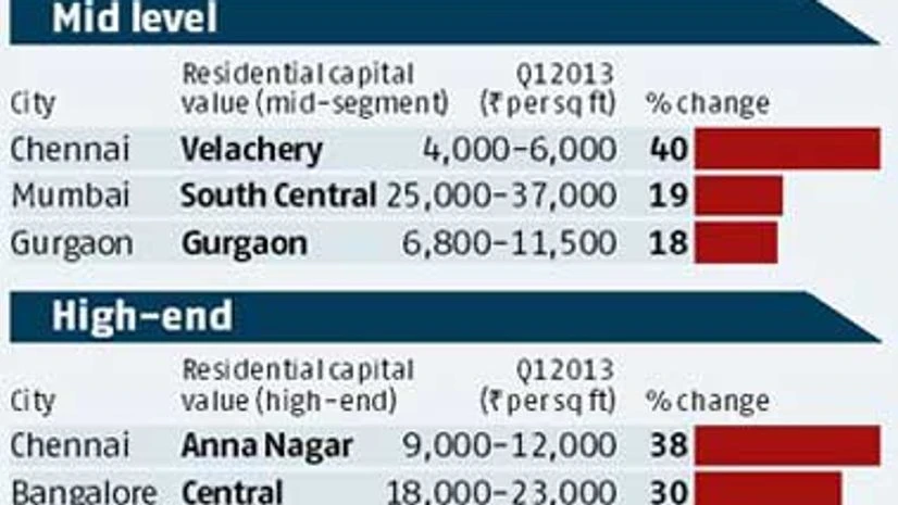 In the high-end segment, Chennai was followed by Bangalore and Gurgaon with appreciation in capital values of 30 per cent and 29 per cent, respectively, during the same period compared to the first quarter of FY13, according to a report by Cushman & Wakefield.