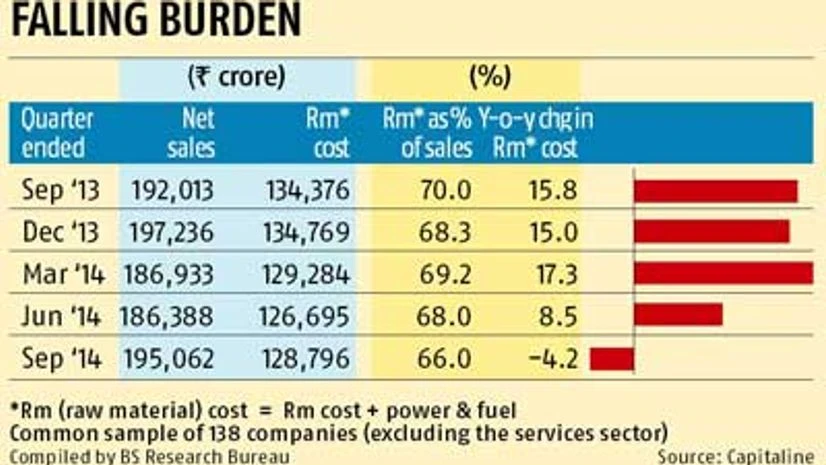 India Inc has seen its raw material cost as a percentage of sales coming down in the June-September period, after many quarters. As the impact of falling commodity prices has yet been yet reflected in the results, the coming quarters should see a further fall in raw material costs.