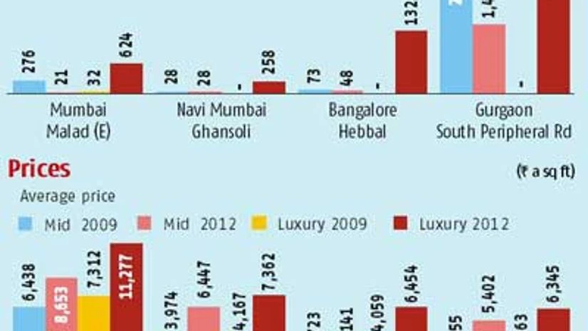 The price swing also reflects the rush for luxury. The average price of an absorbed unit in the luxury segment in Gurgaon increased to Rs 6,345 a sq ft in 2012 from Rs 2,563 a sq ft in 2009. In Malad, the price stood at Rs 11,227 a sq ft in 2012 against Rs 7,312 in 2009 (see chart).