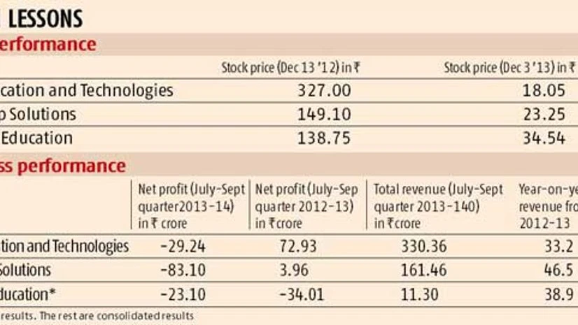 The going has been tough for other companies in the education business, too. Everonn Education reported standalone sales of Rs 11 crore and net loss of Rs 23 crore for the quarter ended September.
