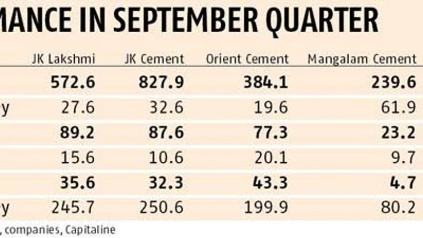 Mid-cap cement players such as JK Lakshmi Cement, JK Cement and Orient Cement, along with Mangalam Cement and Dalmia Bharat, have hit new 52-week highs recently, post declaration of their September quarter results. While the first four have seen 19-62 per cent year-on-year growth in revenues, Dalmia Bharat has lagged, with a 2 per cent fall in revenues. However, the rebound in profitability of Dalmia Bharat with 30 per cent year-on-year growth in Ebitda (earnings before interest, tax, depreciation and amortisation) boosted its stock price.