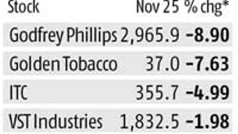 Shares of market leader ITC fell five per cent, the most in five months, and accounted for most of the decline in the benchmark Sensex and Nifty. Other tobacco firms, including Godfrey Phillips and Golden Tobacco, dropped two-eight per cent.