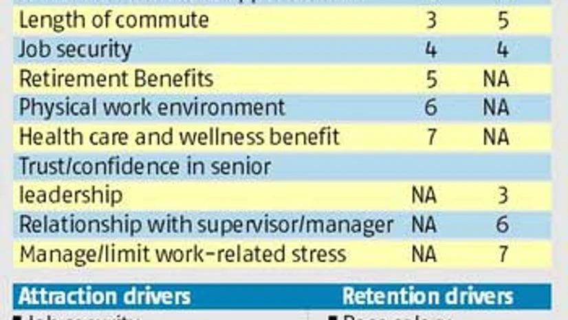 Job security remains the No. 1 reason that attracts employees in India, while salary is the top driver to retain them, followed by career advancement opportunities. What's interesting is that Indian employees cite the length of commute from their home to workplace as the third-most important retention driver.