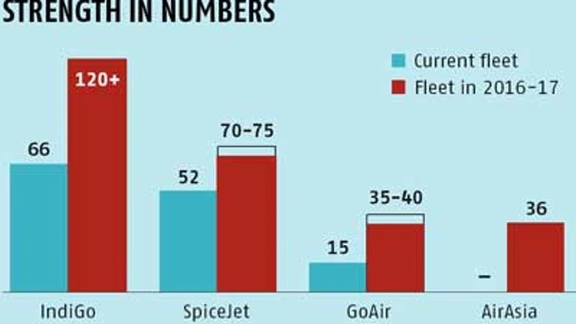 To put things into perspective, based on new aircraft delivery schedules, IndiGo will continue to have a lion's share of over 45 per cent of the capacity of all low-cost carriers put together (including AirAsia) by 2016-17 (currently it is 49 per cent). In the same period, AirAsia will acquire 36 new aircraft, a fleet that will be a little over a third of IndiGo's 120 aircraft. If aircraft capacity is an indication of market share, AirAsia will not have more than 15 per cent of the market. Even that, analysts say, will be carved out from smaller low-cost carriers, not IndiGo. In fact, AirAsia's fleet size would be smaller than even GoAir, if trends based on its orders are anything to go by, and it will remain the smallest low-cost carrier in terms of fleet.
