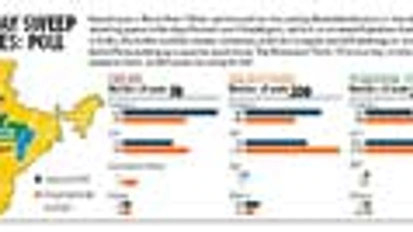 According to a Times Now-C Voter opinion poll on the coming Assembly elections in four states, the Bharatiya Janata Party is seen retaining power in Madhya Pradesh and Chhattisgarh, while it could wrest Rajasthan from the Congress by winning a majority of seats. In Delhi, the battle could be closely-contested, with the Congress and BJP winning an almost equal number of seats and the Aam Aadmi Party putting up a surprise good show. The Hindustan Times-C Fore survey, on the other hand, forecasts the Congress' return to power in Delhi, as AAP spoils the party for BJP. (Click on the image)