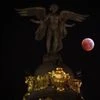 The moon is seen beside "Victoria Alada" statue on the top of Metropoli building during a total lunar eclipse, known as the "Super Blood Wolf Moon" in Madrid, Spain.