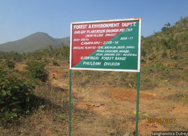 Signboards, such as this one erected in Bakingia village in Kandhamal district, Odisha, proclaim sites where the forest department has sown plantations, and serve to keep tribespeople away from lands they are entitled to access under the Forest Rights Act.