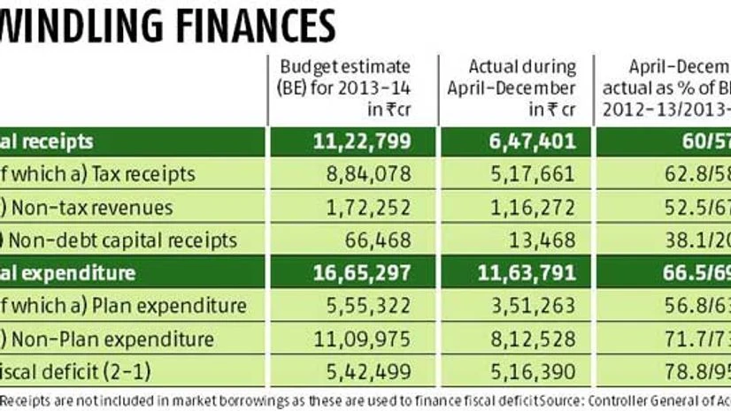Data showed that slowing down economy had an impact on public finance. Till December 2013, tax receipts stood at 58.6 per cent of BE against 62.8 per cent in the corresponding period of FY13. Even then, tax collections fell short of about Rs 30,000 crore in the entire year.