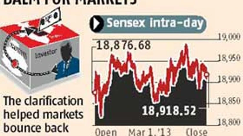 After the clarification, the BSE Sensex today bounced back from three-month lows to end nearly 57 points higher at 18,918.52. The NSE Nifty rose by 26.65 points to 5,719.70. Foreign institutional investors (FIIs) net bought shares worth Rs 629 crore on Friday after turning a net seller on Thursday, for the first time in 2013.