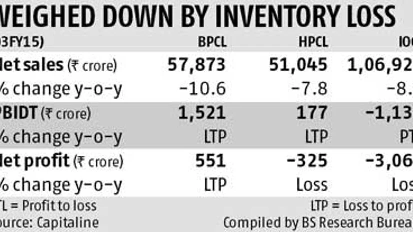 However, high inventory losses (due to a sharp fall in crude oil prices, totalling a combined Rs 17,000 crore,) along with foreign exchange losses, impacted profits of all the OMCs in the quarter. BPC was the only one of the three to report a net profit. HPC had a 81 per cent fall over a year before, to a net loss of Rs 325 crore. IOC's net loss was Rs 3,069 crore, up 123 per cent over the year-ago period.
