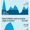 Production grows only 2% in September; rate of retail inflation back in double digits in October