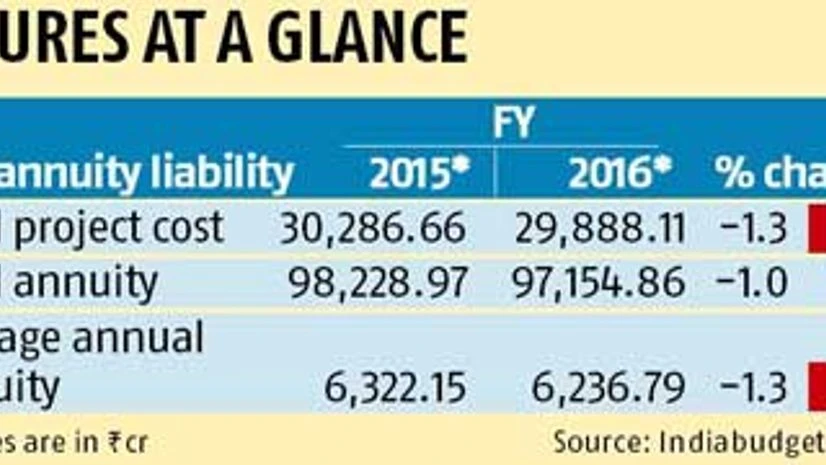 The average annual annuity outgo in 2015-16 has also fallen by 1.3 per cent to Rs 6,236 crore from Rs 6,322 crore in 2014-15. BOT projects are awarded under the aegis of the National Highways Authority of India.