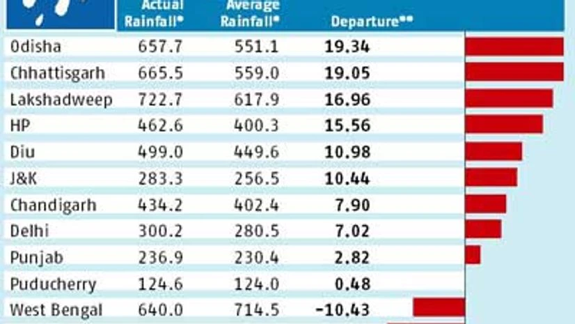 According to some senior IMD officials, Odisha and Chhattisgarh received 19 per cent more than the average rainfall, while rains in Lakshadweep and Himachal Pradesh were 17 per cent and 15 per cent, respectively, more than normal in June and July.