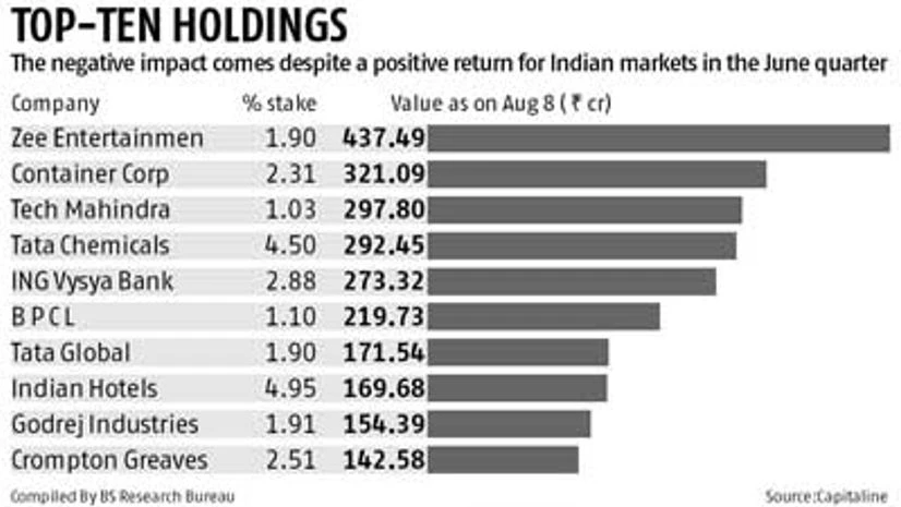The culprit may have been the rupee, which dropped 9.41 per cent against the dollar to Rs.59.39 during the June quarter. A depreciating currency reduces returns of foreign investors.