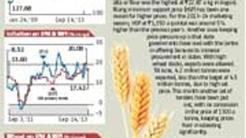 For households, the average all-India retail price of atta or flour was the highest at Rs 22.87 a kg in August. Rising minimum support price (MSP) has been one reason for higher prices. For the 2013-14 marketing season, MSP at Rs 1,350 a quintal was around 5% higher than the previous year's.