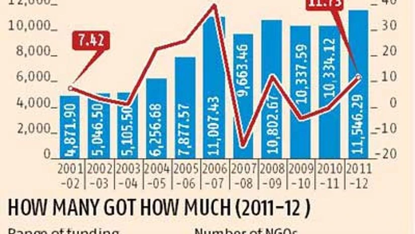 Ministry records show in 2011-12, NGOs had received Rs 11,546 crore from abroad. Of these, 20,297 grants were below Rs 1 crore and 148 above Rs 10 crore.
