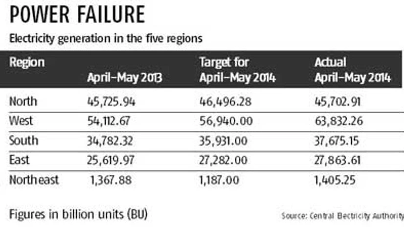 Fresh generation and deficit data from the Central Electricity Authority (CEA) corroborate the crisis. In north India, there are power plants with a capacity of 56,600 Mw - roughly a fifth of India's total current monitored power capacity of 214,000 Mw. Power generation in all the regions registered growth between April and May, with the only exception being the North. Here, the plants generated 45,702 billion units (BUs) during the period, 23 BUs less than in the same period in 2013. This is in contrast to the 16 per cent growth in generation in the West, 9 per cent in South and 8 per cent in the East. It isn't surprising then that peak power deficit in the North jumped to 7.4 per cent in April (data for May is currently not available) against 5.1 per cent in the same months last year. In comparison, the national deficit went down from 7.4 per cent in April 2013 to 5.4 per cent in April this year.