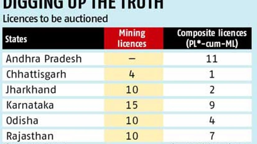 According to the latest information provided by the state governments to the Centre, a total of 108 non-coal mineral blocks would be auctioned by the year-end. Around 66 and 21 blocks would be auctioned for mining leases (ML) and composite licences, respectively. Moreover, Chhattisgarh has earmarked 21 other mineral blocks for the second phase of auction to take place by December. It is, however, not clear as to how many of these would be auctioned for ML or composite licence.