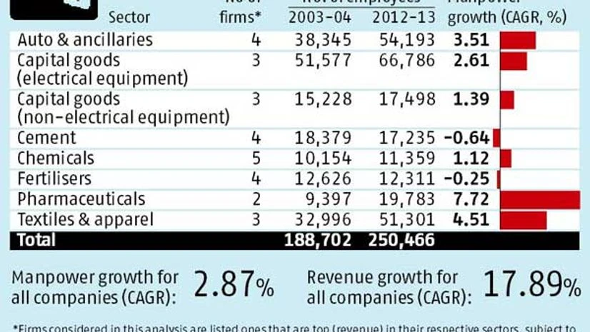 These 28 companies, from industries as diverse as automobiles, capital goods, cement, chemicals, fertilisers, pharmaceuticals and textiles, saw their revenue grow 17.8 per cent a year during this period. Their workforce increased from 188,702 in 2003-04 to 250,466 in 2012-13. They simply added 61,000 jobs over the decade, of which more than half were in just two sectors, capital goods and textiles.