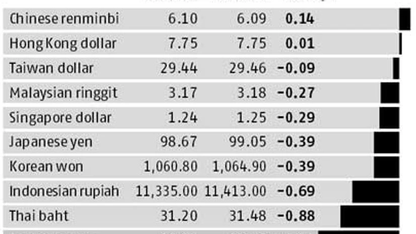 The rupee lost 1.2 per cent from November 1 to 62.475 per dollar in Mumbai, according to prices from local banks compiled by Bloomberg. Indonesia's rupiah weakened 0.7 per cent to 11,410, Thailand's baht fell 0.9 per cent to 31.475 and Malaysia's ringgit dropped 0.3 per cent to 3.1794.