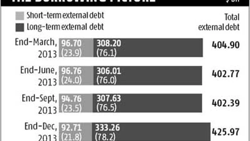 India's total external debt rose 5.9 per cent to $426 bn as on December 31, 2013, against $402 bn as on September 30, 2013. It was largely because of NRI (non-resident Indian) deposits, which increased due to the swap facility of the Reserve Bank of India.