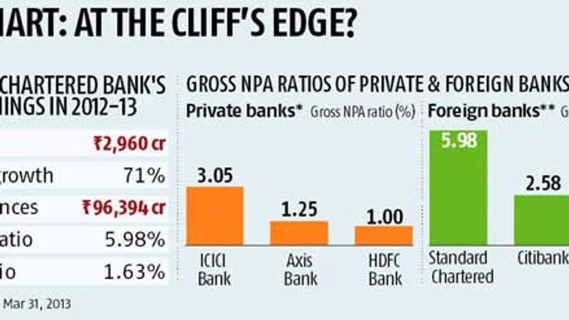The lender’s gross bad loan ratio in India continues to remain close to six per cent, one of the highest among foreign banks operating in the country. Standard Chartered Bank’s India branches reported a gross bad loan ratio of 5.98 per cent and net non-performing asset ratio of 1.63 per cent at the end of March 2013. The fund and non-fund based loan exposure to the gems and jewellery segment was Rs 3,542 crore, while to the telecom industry it was Rs 4,139 crore. Gross advances (fund- and non-fund based) at the end of 2012-13 were at Rs 96,394 crore.