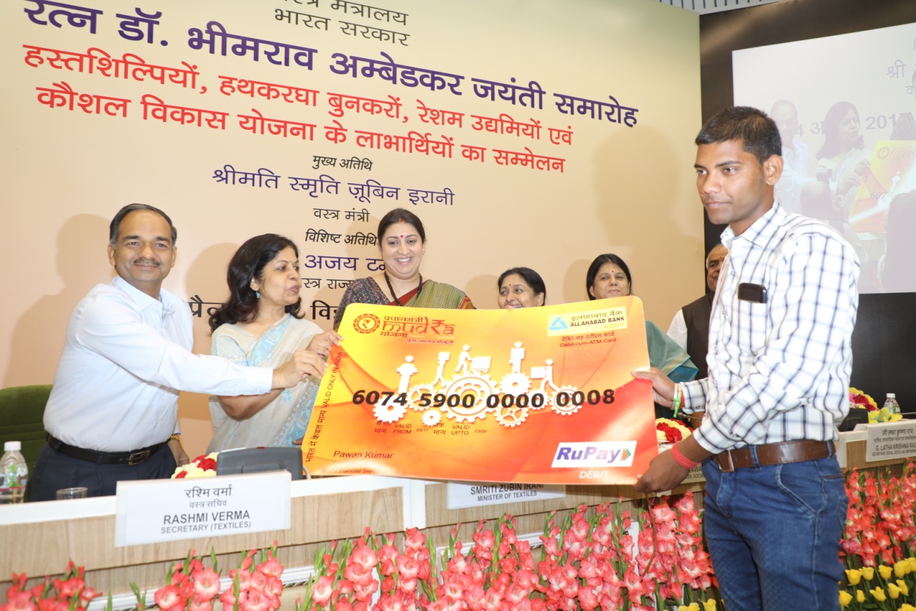 The Minister recalled the testimony of a weaver from Odisha who has been able to double his monthly income from Rs. 4,000/- to Rs. 8,000/-, with the help of Pradhan Mantri MUDRA Yojana. She also noted the story of a labourers son from Indore, who was able to get placed under ISDS and is now able to dream of a better future. Smt. Irani also spoke of a girl from Bareilly who demonstrated the benefits of the improved artisan tool-kit via video-conference to the Minister and others present today. Encouraging her to be an instructor as well, Smt. Irani directed the officials to utilize her skills in communicating the benefits of improved toolkits to other artisans. Stating that Dr. Ambedkar dreamed of an India where every Indian would be able to contribute to nation building, by ones own honest efforts and education, the Minister appreciated everyone associated with the textiles sector, for their contribution in the economic empowerment of people such as these.