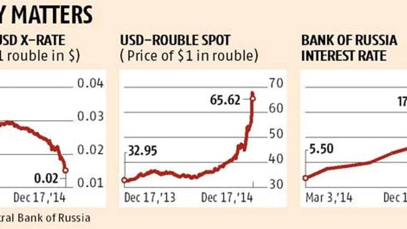 The dollar-denominated RTS Index of shares jumped 17 percent, the most since 2008, to 737.34. Russian government 10-year bond yields dropped 2.76 percentage points to 13.30 per cent, after Tuesday reaching the highest since at least 2007.