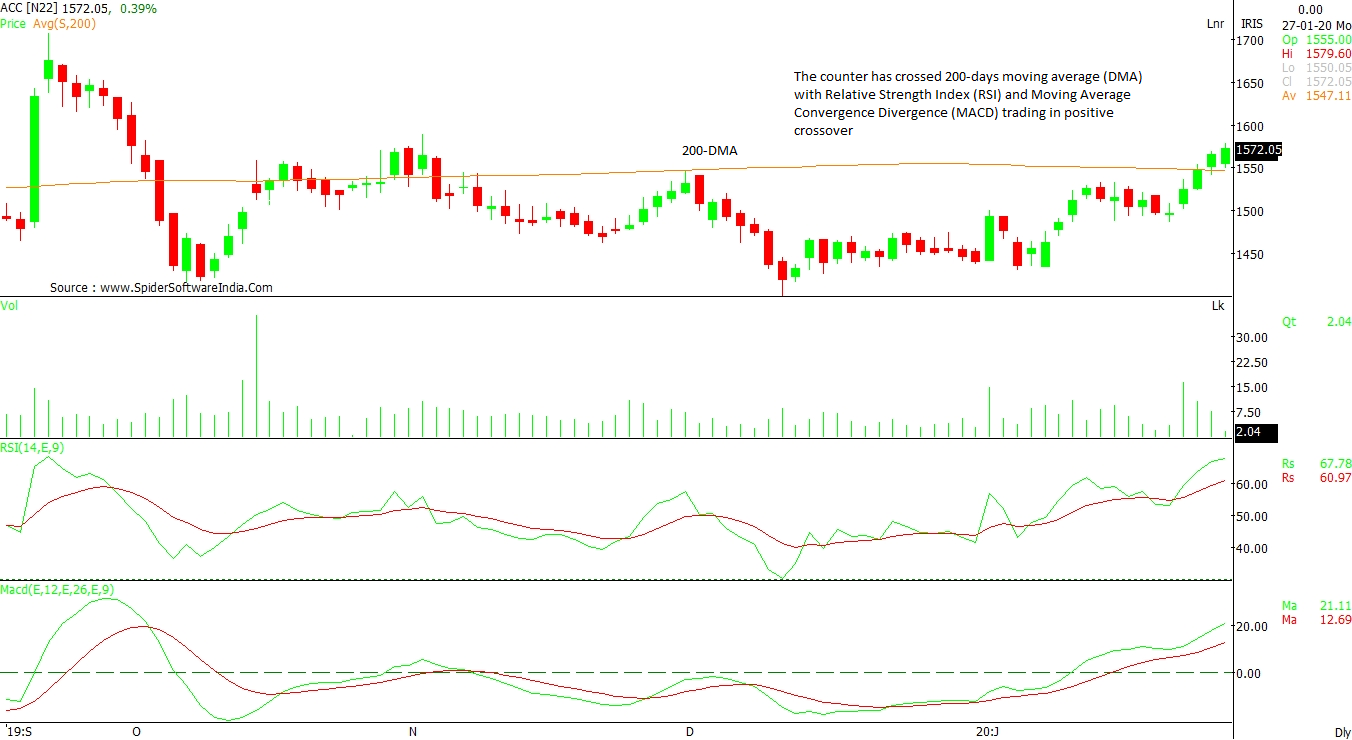 ACC Ltd (ACC): The counter has crossed 200-day moving average (DMA) with Relative Strength Index (RSI) and Moving Average Convergence Divergence (MACD) trading in a positive crossover on the daily chart, a sign of an upward trend. This rally may propel the stock to Rs 1,650 in coming sessions, which is its trend line resistance as per the weekly chart. On the other hand, Rs 1,500 remains a support -- this is accompanied by 50-DMA placed at Rs 1,480 levels. CLICK HERE FOR THE CHART