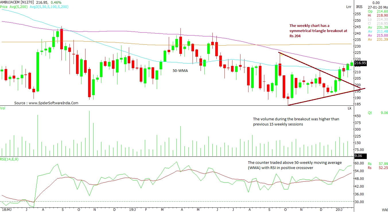 Ambuja Cements Ltd (AMBUJACEM): The stock's weekly chart has a symmetrical triangle breakout at Rs 204 levels. The volume during the breakout was higher than iin the previous 15 weekly sessions. The counter traded above 50-weekly moving average (WMA) with RSI in positive crossover. Now, as the counter has crossed significant resistance of Rs 214-Rs 215, the rally should lead to Rs 220 on primary phase and then to Rs 225, the level where selling pressure was seen last time as per the daily chart. CLICK HERE FOR THE CHART