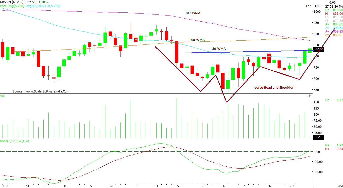 Grasim Industries Ltd (GRASIM): The formation of Inverse Head and Shoulder pattern on the weekly chart has a neckline breakout at Rs 826 which the counter has crossed successfully today. This breakout should initially see Rs 850, followed by Rs 882 -- which is its 200 WMA -- as immediate levels. The support remains at Rs 800 and Rs 770 levels. Moerover, the MACD is attempting to cross zero line upward, a sign of a positive strength. CLICK HERE FOR THE CHART
