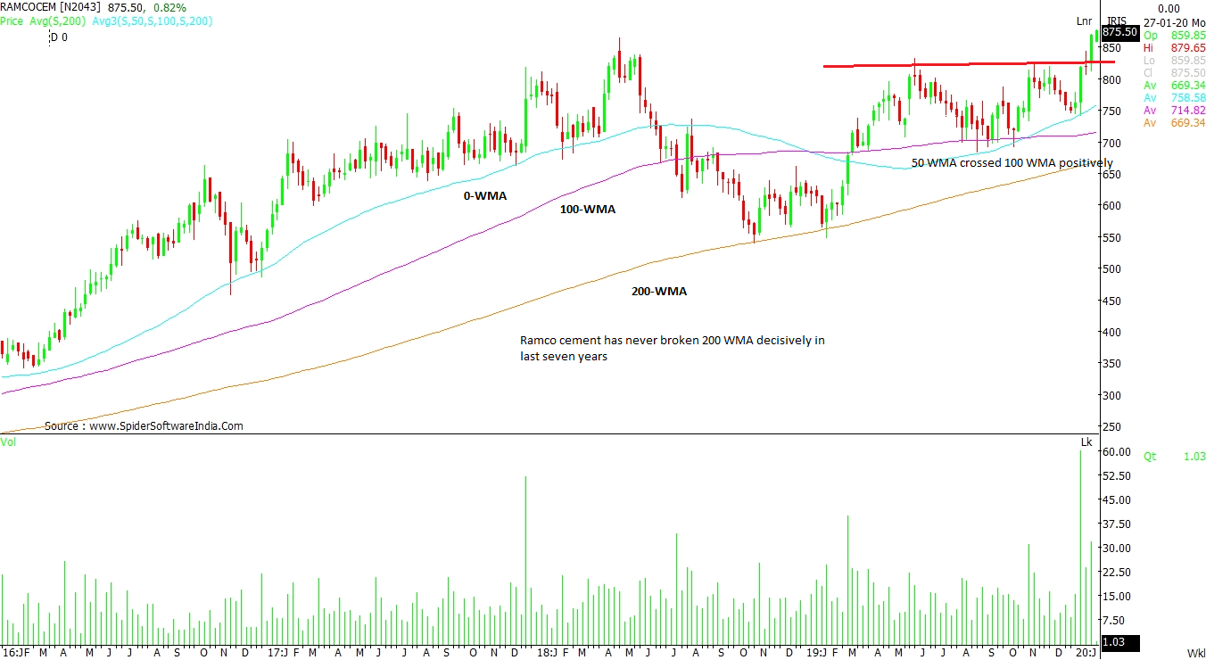 The Ramco Cements Ltd (RAMCOCEM): The counter has climbed a new lifetime high of Rs 879.65. Now that the 50 WMA has crossed 100 WMA positively, this rally may lead to Rs 950 and Rs 980 levels. The immediate support comes at Rs 830 and thereafter at Rs 800 on a closing basis. CLICK HERE FOR THE CHART