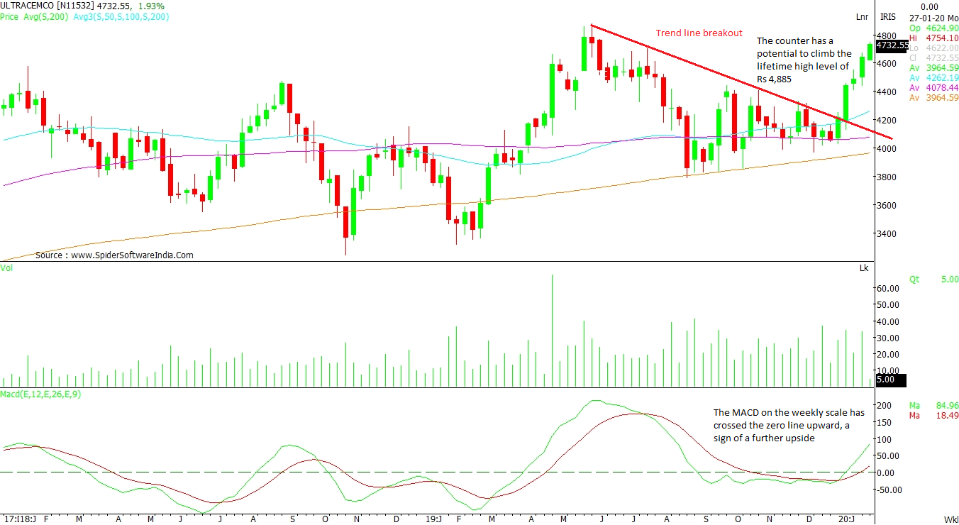 UltraTech Cement Ltd (ULTRACEMCO): A perfect example of a trend line breakout and a support of 200 WMA is pushing this counter to the higher levels, as per the weekly chart. The counter has a potential to scale the lifetime high level of Rs 4,885 as per the monthly chart. The MACD on the weekly scale has crossed the zero line upward, a sign of further upside. Immediate support comes in at Rs 4,400 levels. CLICK HERE FOR THE CHART