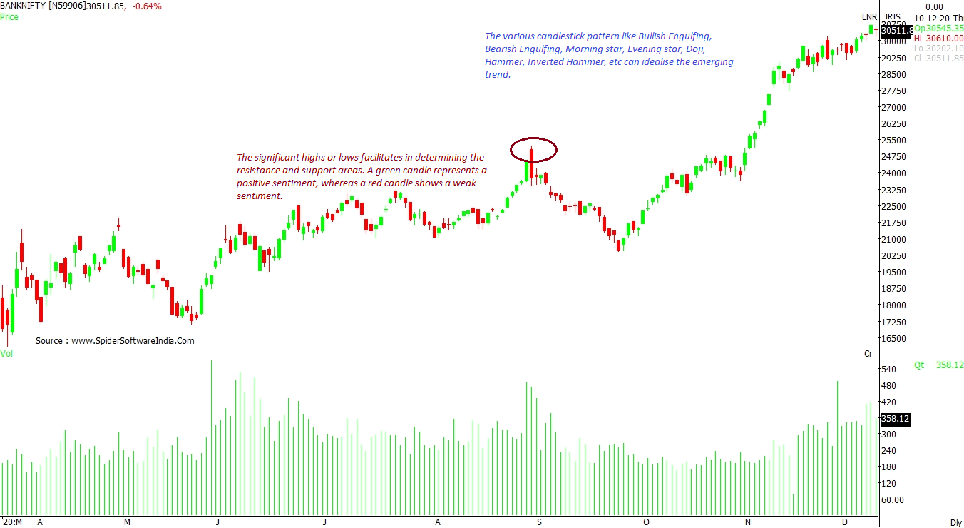 Looking at the charts on a broader time-frame, one can easily identify the prevailing bullish or bearish sentiment. Whenever the stock or index crosses significant candlestick levels, the trend is said to have gained momentum. Such a move's strength can be ascertained by the various forms of candlestick patterns.