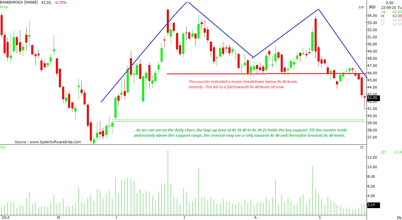 BANK OF Baroda (BANKBARODA): The counter indicated a major breakdown below Rs 46 levels recently. This led to a fall towards Rs 40 levels till now. As we can see on the daily chart, the gap-up area of Rs 39.40 to Rs 39.25 holds the key support. Till the counter trade defensively above this support range, the reversal may see a rally towards Rs 46 and thereafter towards Rs 48 levels. CLICK HERE FOR THE CHART
