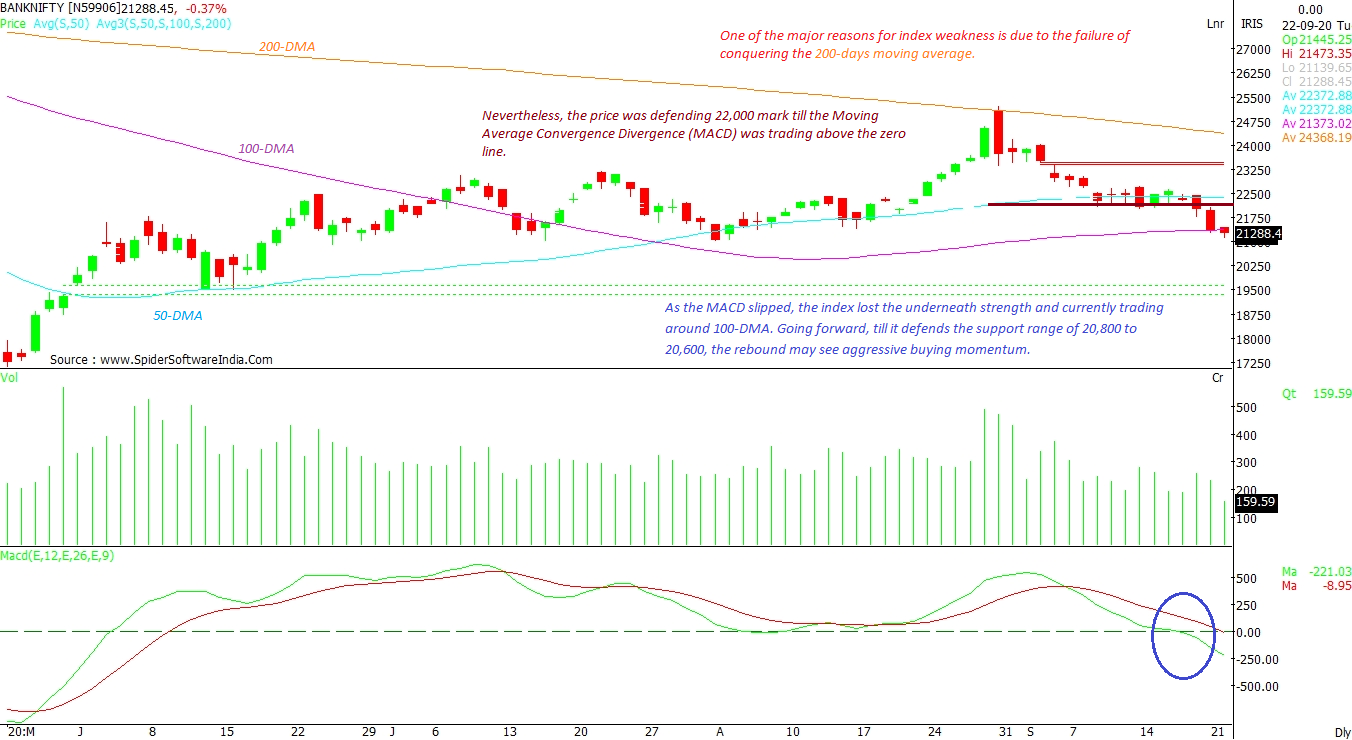 NIFTYBANK: One of the major reasons for the index's weakness is its inability to conquer the 200-day moving average (DMA). Nevertheless, the price was defending 22,000 mark till the moving average convergence divergence (MACD) was trading above the zero line. As the MACD slipped, the index lost the underneath strength and is currently trading around 100-DMA. Going forward, till it defends the support range of 20,800 to 20,600 level, the rebound may see aggressive buying momentum. CLICK HERE FOR THE CHART