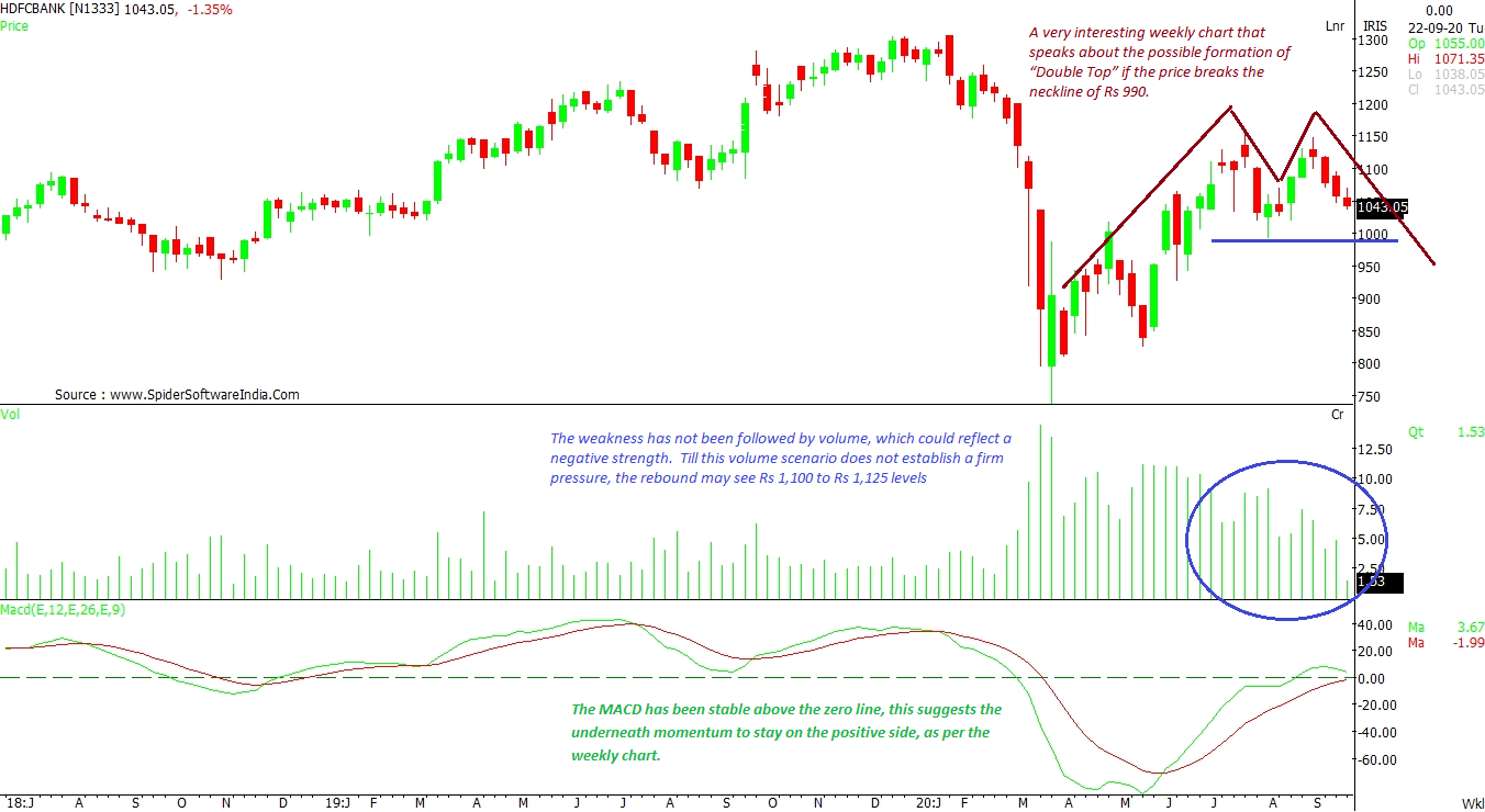 HDFC Bank Ltd (HDFCBANK): The counter has formed a very interesting weekly chart that speaks about the possible formation of “Double Top” if the price breaks the neckline of Rs 990. The weakness has not been followed by volume, which could reflect a negative strength. Till this volume scenario does not establish a firm pressure, the rebound may see Rs 1,100 to Rs 1,125 levels. The MACD has been stable above the zero line, suggesting the underneath momentum to stay on the positive side, as per the weekly chart. CLICK HERE FOR THE CHART