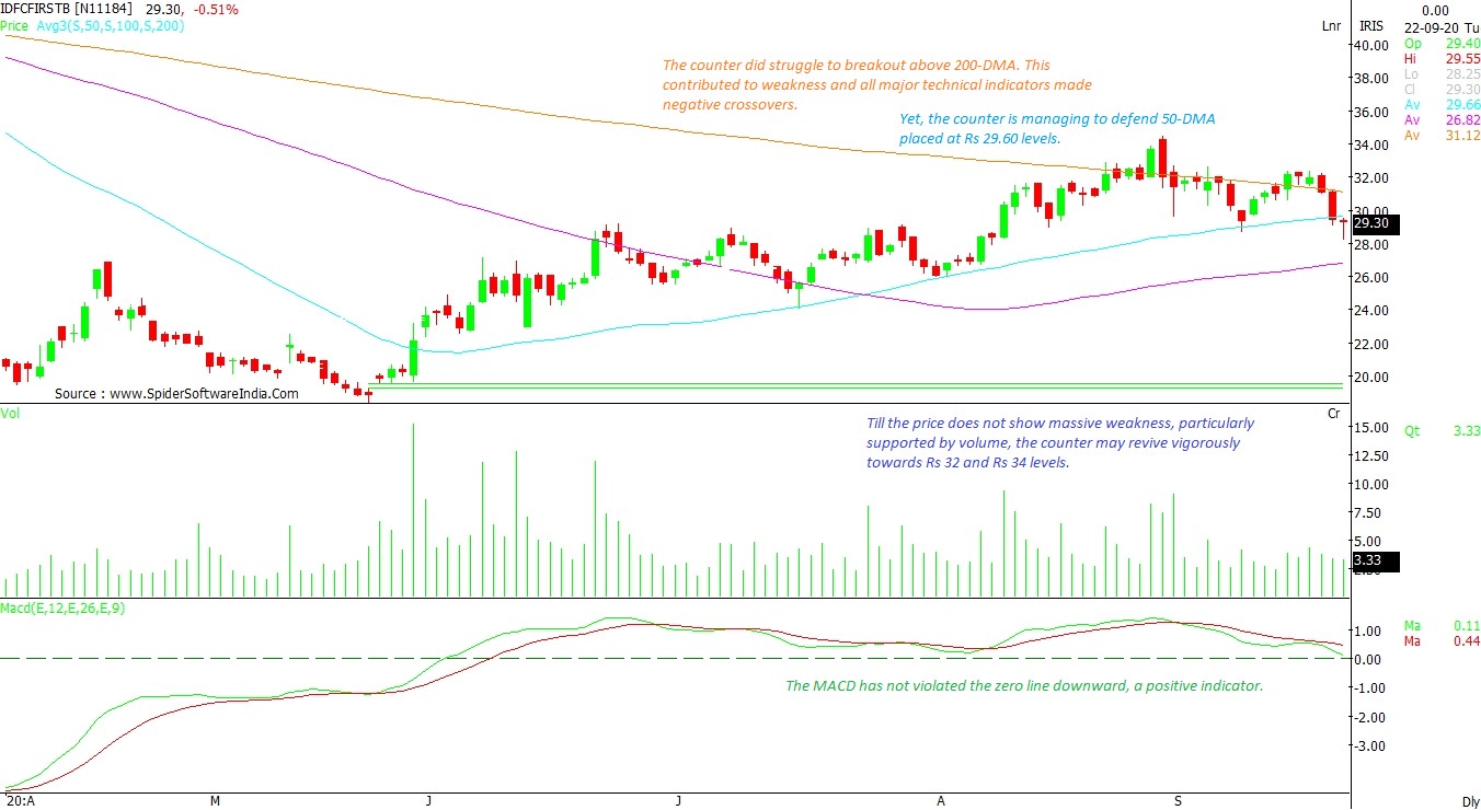 IDFC First Bank Limited (IDFCFIRSTB): The counter did struggle to breakout above 200-DMA. This contributed to weakness and all major technical indicators made negative crossovers. Yet, the counter is managing to defend 50-DMA placed at Rs 29.60 levels. Till the price does not show massive weakness, particularly supported by volume, the counter may revive vigorously towards Rs 32 and Rs 34 levels. The MACD has not violated the zero line downward, which is a positive indicator. CLICK HERE FOR THE CHART