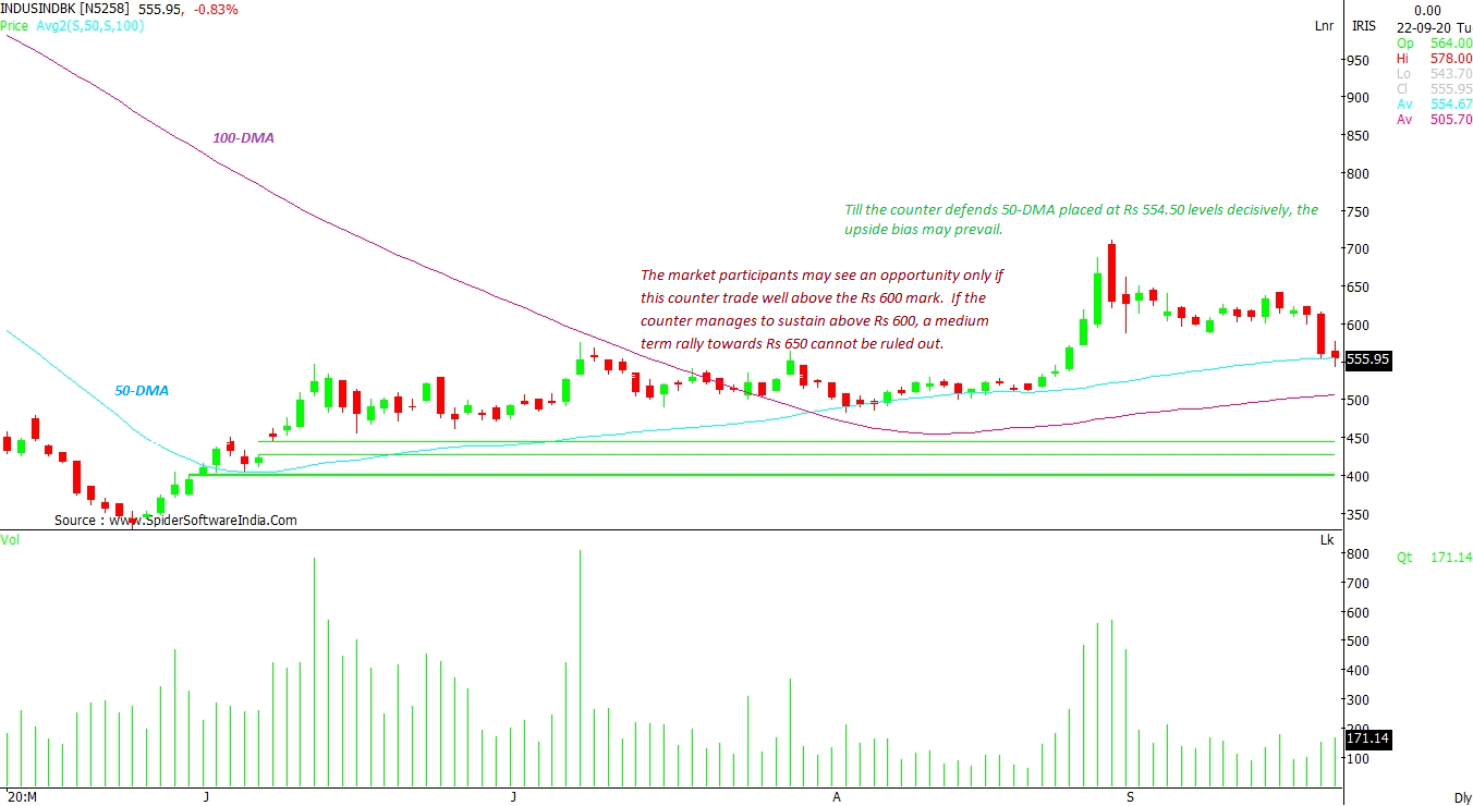 IndusInd Bank Ltd (INDUSINDBK): Till the counter defends 50-DMA placed at Rs 554.50 levels decisively, the upside bias may prevail. The market participants may see an opportunity only if this counter trade well above the Rs 600 mark. If the counter manages to sustain above Rs 600, a medium term rally towards Rs 650 cannot be ruled out. CLICK HERE FOR THE CHART