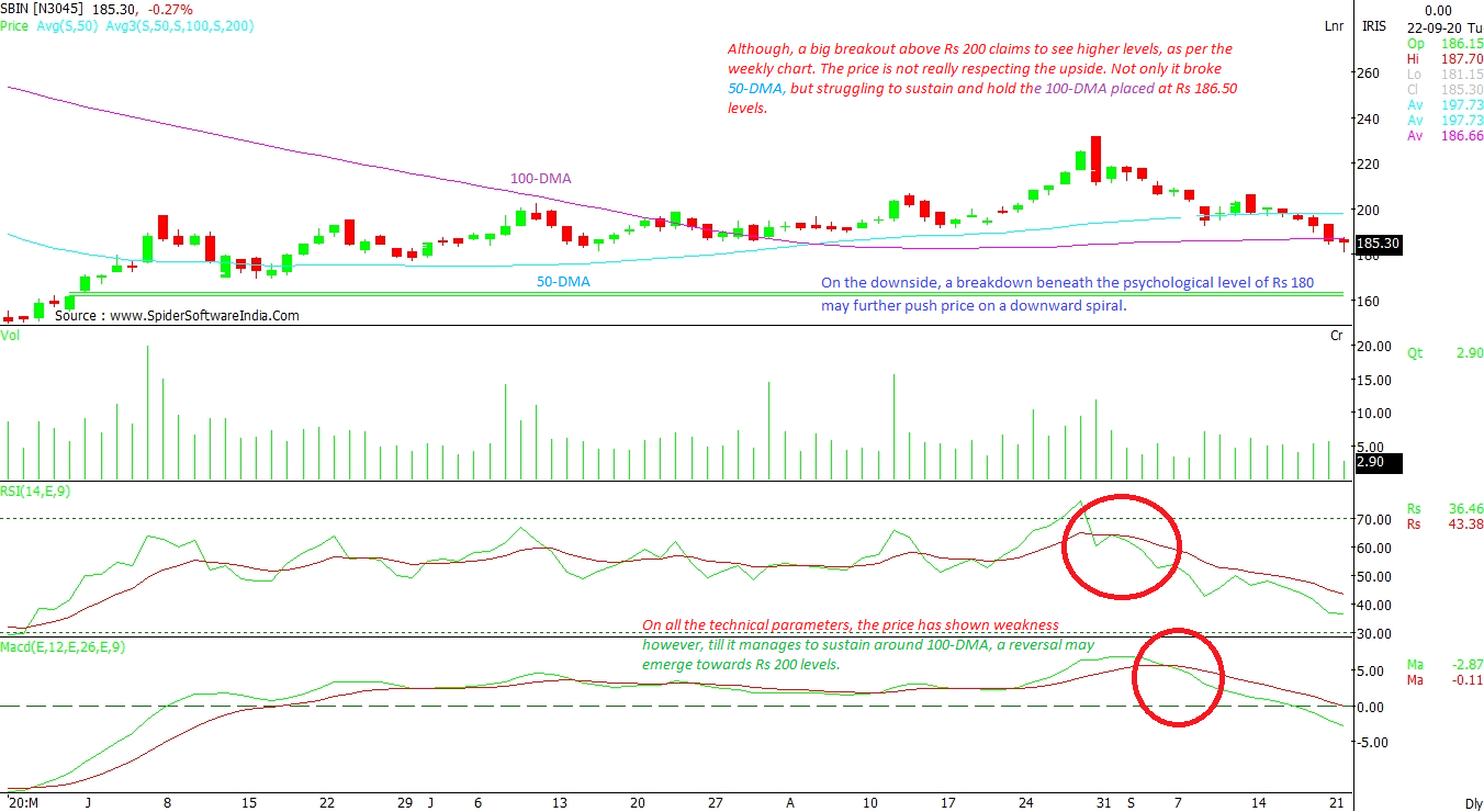 State Bank of India (SBIN): Although a big breakout above Rs 200 claims to see higher levels as per the weekly chart, the price is not really respecting the upside. Not only it broke 50-DMA, but it is struggling to sustain and hold the 100-DMA placed at Rs 186.50 levels. On all the technical parameters, the price has shown weakness; however, till it manages to sustain around 100-DMA, a reversal may emerge towards Rs 200 levels. On the downside, a breakdown beneath the psychological level of Rs 180 may further push price on a downward spiral. CLICK HERE FOR THE CHART