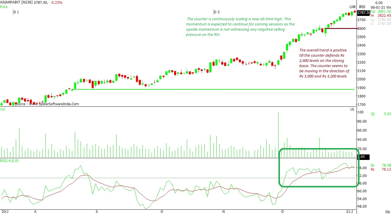 Asian Paints Ltd (ASIANPAINT): The stock is consistently scaling new all-time highs day after day. This momentum is expected to continue in the coming sessions as the upside momentum is not witnessing any negative selling pressure on the RSI. The overall trend is positive as long as the counter defends Rs 2,600 levels on the closing basis. The counter seems to be moving in the direction of Rs 3,000 and Rs 3,200 levels, as per daily chart.