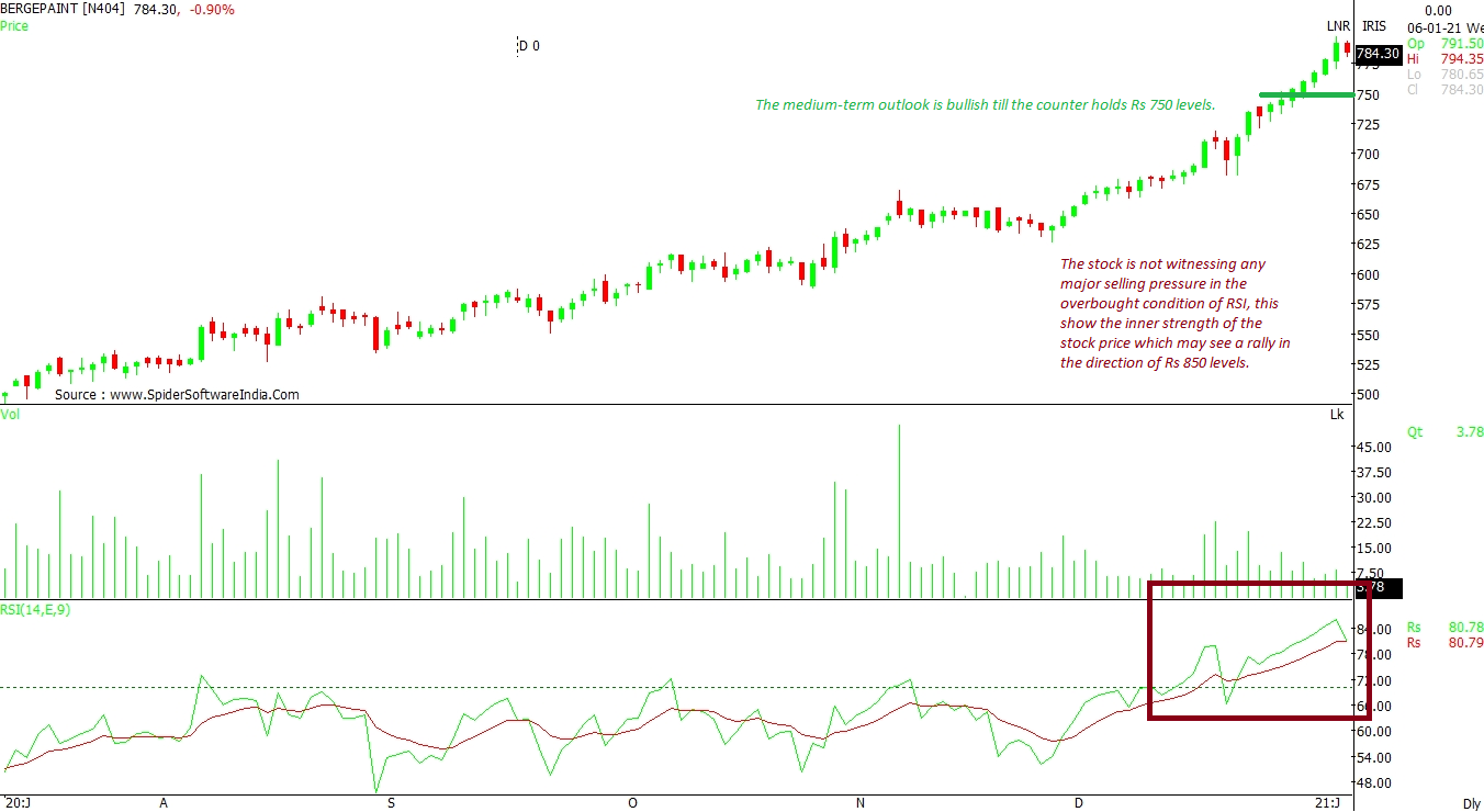 Berger Paints India (BERGEPAINT): The medium-term outlook is bullish till the counter holds Rs 750 levels on closing basis. Despite being in the overbought zone on the RSI indicator, the stock is not witnessing any major selling pressure which shows the stock's inner strength. This positive sentiment may push the stock price towards Rs 850 levels. The counter has a closing basis support of Rs 750 levels.