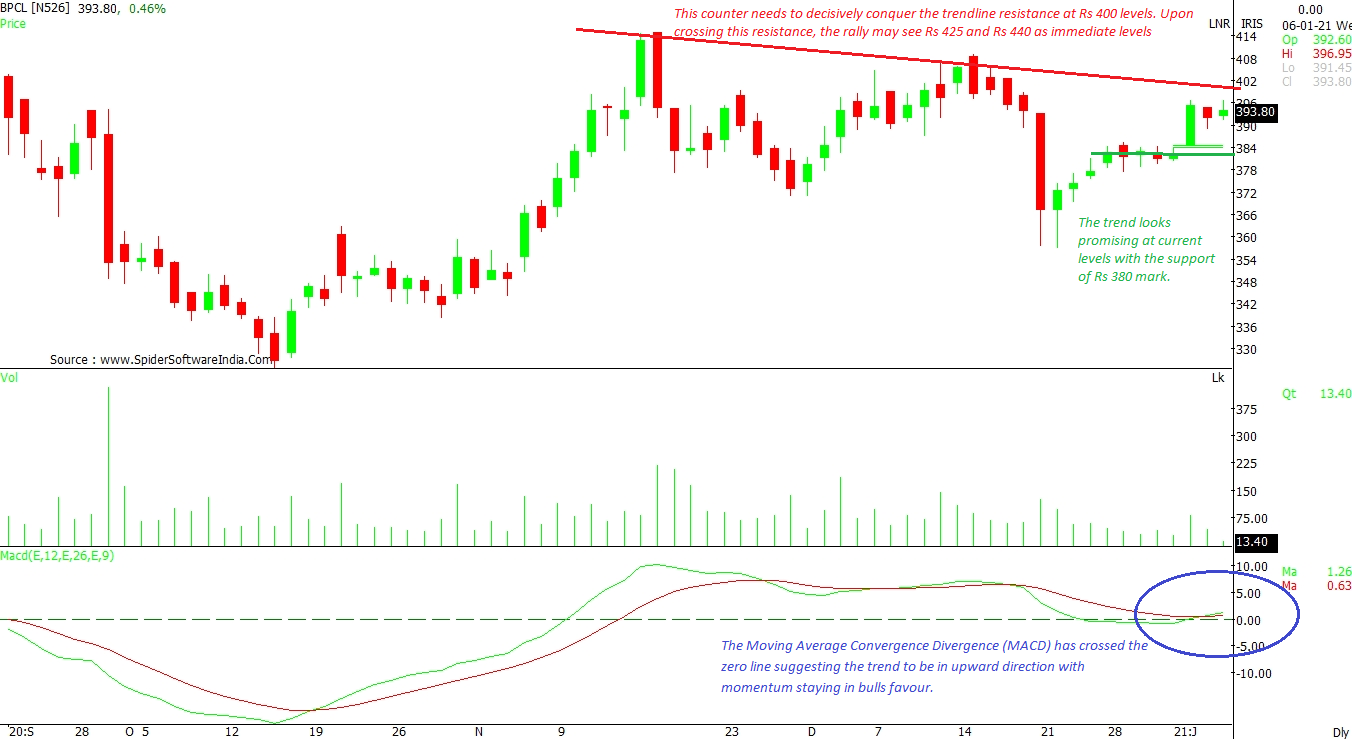 Bharat Petroleum Corporation Ltd (BPCL): The state-owned oil marketing company needs to decisively conquer the trendline resistance of Rs 400 levels to scale up to Rs 425 and Rs 440 levels, as per the daily chart. The trend looks promising at current levels with the support of Rs 380-mark. The Moving Average Convergence Divergence (MACD) has crossed the zero line, suggesting that the trend in the stock remains positive with momentum staying in the favour of the bulls.