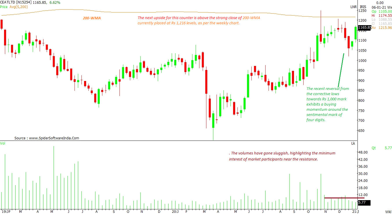 CEAT Limited (CEATLTD): This tyre stock needs to close above Rs 1,216 levels, which is its 200-WMA, to see next leg of rally, weekly charts suggest. The recent reversal from the lows of Rs 1,000-mark exhibits a buying sentiment around the crucial mark of four digits. However, volumes in the stock have become thin in the recent past, highlighting low interest of market participants near the resistance.