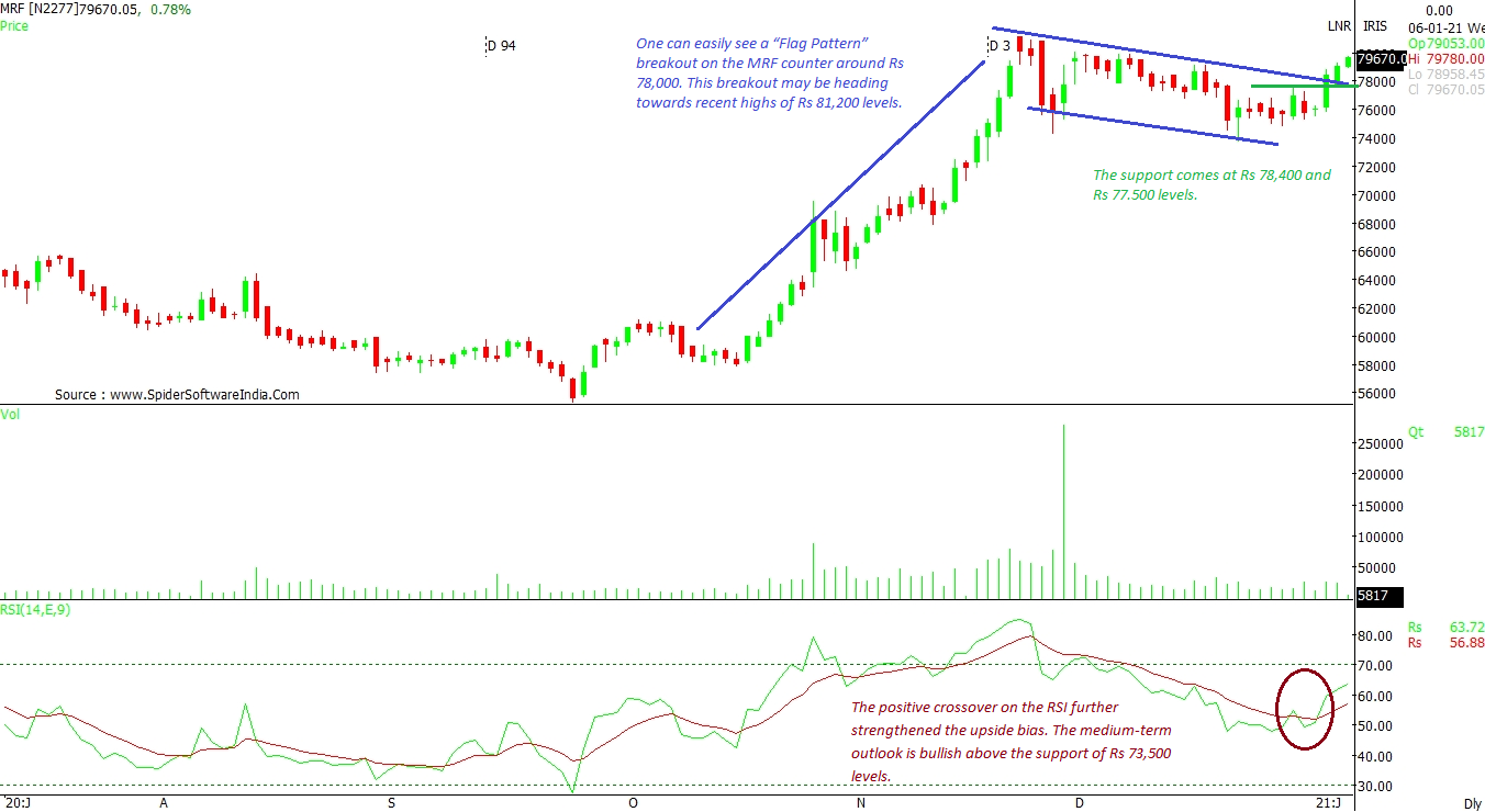 MRF Limited (MRF): One can easily see a "Flag Pattern" breakout on the MRF stock around Rs 78,000. This breakout may be heading towards recent highs of Rs 81,200 levels. The support comes at Rs 78,400 and Rs 77,500 levels. That apart, positive crossover on the RSI further strengthens the upside bias. The medium-term outlook is bullish if the stock holds the support of Rs 73,500 levels.